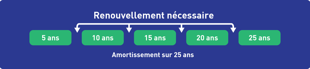 Lorsque vous obtenez un prêt hypothécaire, vous acceptez une période d’amortissement et un terme hypothécaire. L'amortissement est la durée nécessaire pour rembourser la totalité du prêt hypothécaire, tandis que le terme hypothécaire est la durée pendant laquelle votre contrat hypothécaire est en vigueur. Au Canada, le terme hypothécaire le plus courant est de 5 ans et l’amortissement le plus courant est de 25 ans. À la fin de votre terme hypothécaire, vous devrez renouveler votre prêt si vous ne remboursez pas le solde dû.
